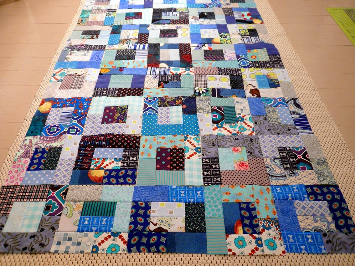 (Kuvassa on vain sinisiä tilkkublokkeja, kuten varmasti huomaatte. En ole ehtinyt ottaa kuvaa neljästä jo valmistamastani violetista blokista.)