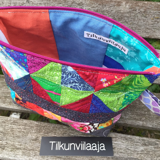 Sain tilkkuystävältäni Soilelta pikkutilkkuja, joihin hän oli jo kyllästynyt. Hänelle roska, minulle aarre. Kerroinkin jo aiemmin, miten mukavia tuokioita vietin pienten tilkkujen parissa, ja nyt voin näyttää jotain valmista. Pikkutilkuista syntyi pieni vetoketjupussukka, jolle annoin tietenkin nimen Aarre.