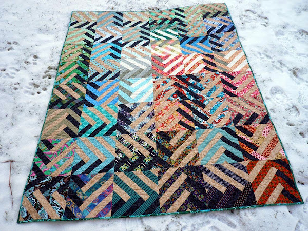 Löysin blokkiohjeen American Patchwork and Quilting -lehdestä ja ompelin blokit kurinalaisesti ohjetta noudattaen. Tein ensin koeblokin, joka tietenkin pääsi myös varsinaiseen tilkkupintaan. Paloin halusta tehdä lisää kalanruotomallisia blokkeja, mutta minua pidätti lehdestä katsomani kangasmenekkitieto: tarvitsisin tummempaa ja vaaleampaa kangasta kumpaakin noin kolme metriä. Eihän minulla sellaisia määriä yhtä kangasta ollut varastossa! Eikä ole vieläkään!