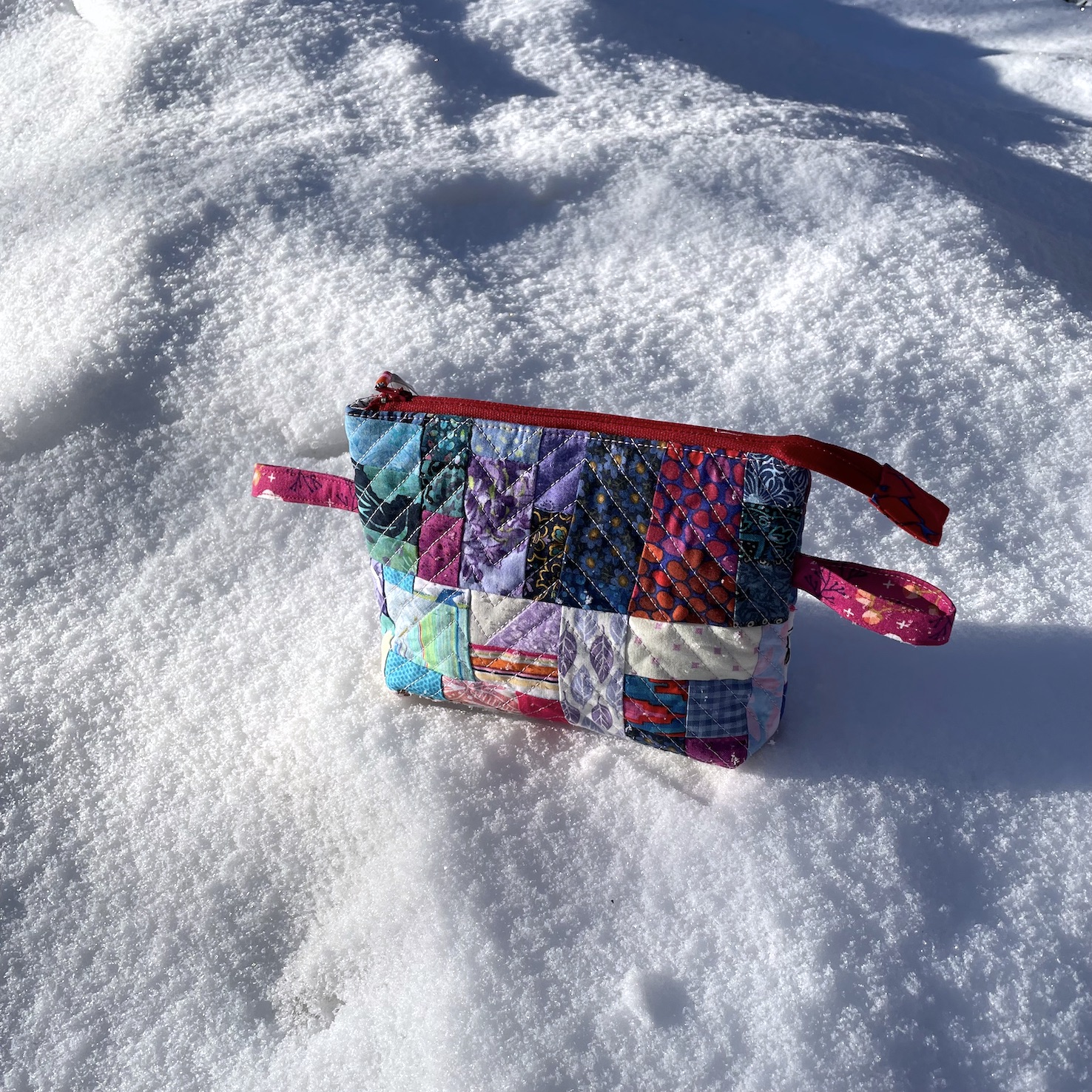 Kuvaushetkellä pihaa vaivasi auringottomuus, mutta otin valoisampana päivänä uuden kuvan. Ystävänpalvelus-tilkkupussukka kylpee talvisessa valossa: